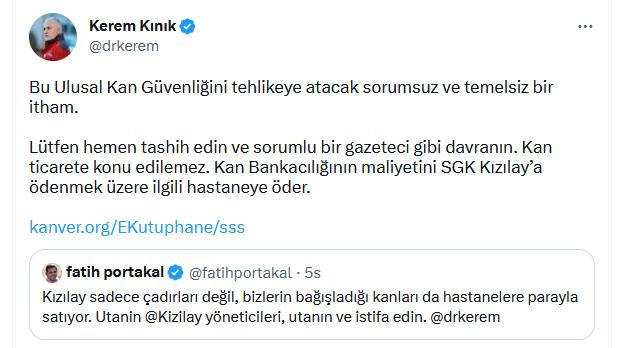 Kan bağışının ticarete husus edilemeyeceğini belirten Kınık, ”Bu Ulusal Kan Güvenliğini tehlikeye atacak sorumsuz ve temelsiz bir itham. Lütfen çabucak tashih edin ve sorumlu bir gazeteci üzere davranın. Kan ticarete mevzu edilemez. Kan Bankacılığının maliyetini SGK Kızılay’a ödenmek üzere ilgili hastaneye öder.” diye yanıt verdi.