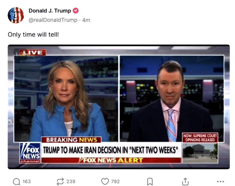 ABD Başkanı Donald Trump, ülkesinin İsrail ile İran ortasındaki savaşa dahil olup olmayacağına ait Truth Social hesabından açıklama yaptı. FOX News’teki “İran’ı iki haftalık mühlet dolmadan vurup vurmayacağına” dair yapılan yoruma alıntı yapan Trump, “Bunu yalnızca vakit gösterecek” dedi.