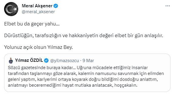İYİ Parti Genel Lideri Meral Akşener ise, Sözcü’deki misyonlarına son verilen Yılmaz Özdil’e dayanak çıkarak, “Elbet bu da geçer yahu. Dürüstlüğün, tarafsızlığın ve hakkaniyetin kıymeti elbette bir gün anlaşılır” kelamlarını sarf etmişti.